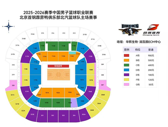 2025-2026CBA北汽男篮主场座位图(首钢冰球馆):