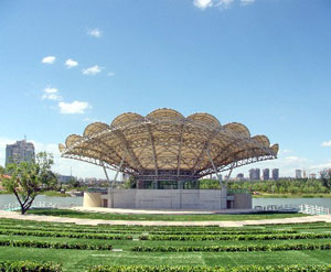为迎接2008年北京奥运会,使北京市民在奥运会举办前及举办期间能够在具有相当规模、水准的露天剧场进行群众性的文化演出,以弘扬中华民族的优秀文化、展示新时期北京人的风采;同时也为了在奥运会期间向全世界各民族的文化交流活动提供演出场所,市文化局经过多方考察后,拟在朝阳公园内建设 “朝阳公园中心岛剧场”。该剧场位于朝阳公园中心岛,东、北、西由朝阳公园北湖环抱,南临奥运沙滩排球场西侧路。项目占地15400平方米,建筑面积1215.23平方米,建筑高度18米。该项目主要建筑为露天剧场舞台及演员化装间等服务用房。
